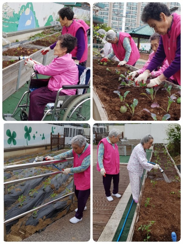2층 치유정원에 상추,브로콜리,토마토 모종을 어르신들과 나눠 심고, 같이 물을 주었습니다.