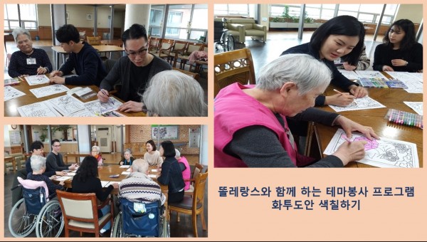 [복지]똘레랑스와 함께하는 재미있는 테마 봉사 페이지 정보 작성자 송유라 작성일2019-03-27 18:10 조회3,269회 댓글0건 관련링크 이전글 다음글 목록 본문 안녕하세요^^3월 23일에 진행된 똘레랑스(자원봉사자 단체) 멤버분들이 동부를 방문해주셨습니다^ㅡ^동부어르신들과 재미나는 화투 도안 색칠하기를 진행하였습니다!!다양한 테마봉사활동을 통하여 입소어르신들의 재미,활력을 느끼시길 바랍니다^^ 감사합니다! 댓글목록 등록된 댓글이 없습니다. 이전글 다음글 목록